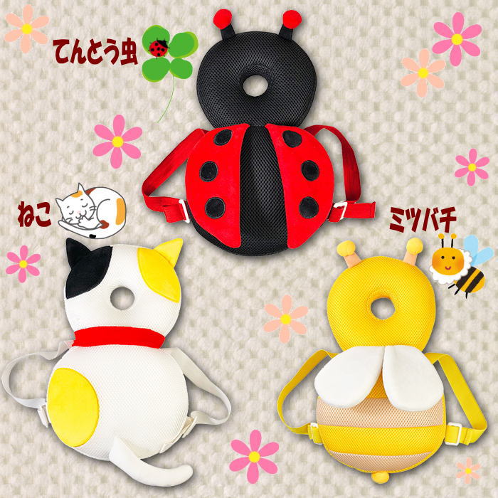 ベビーせおってガードクッション ねこ 商 品 説 明 転倒した赤ちゃんの後頭部をやさしく保護!身体と比べて頭の大きい赤ちゃんは重心が高く安定しないのでよく仰向けに倒れたりします。
